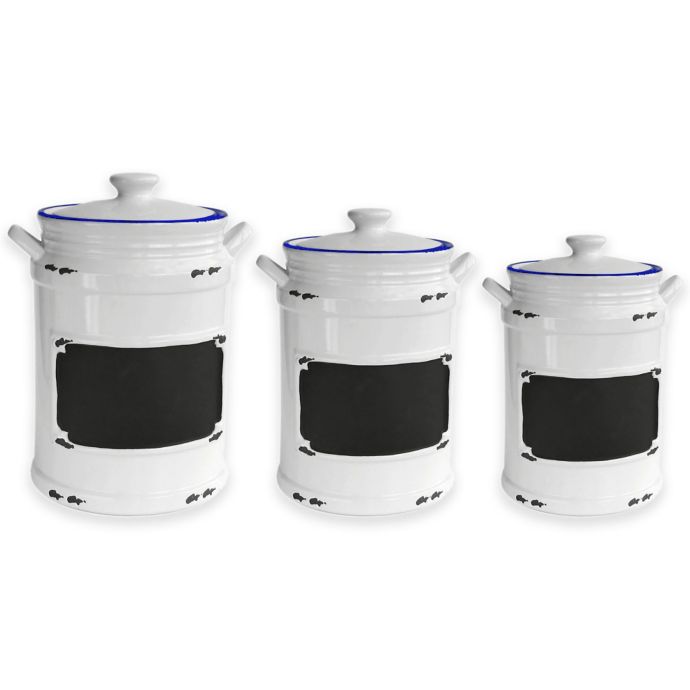 Whie ceramic canisters with chalkboard and spoons set of three. Sold and shipped by demdaco. White mind reader small medium large ceramic canister set with lids 3 pc round canister sets food storage jar container blue by mind reader 27 99 29 99. Oggi 7 piece round ceramic canister set with spoons black. Cheerful and bright this chef ceramic deluxe 3 piece kitchen canister set from lorren home trends makes a delightful and fun addition to any kitchen.